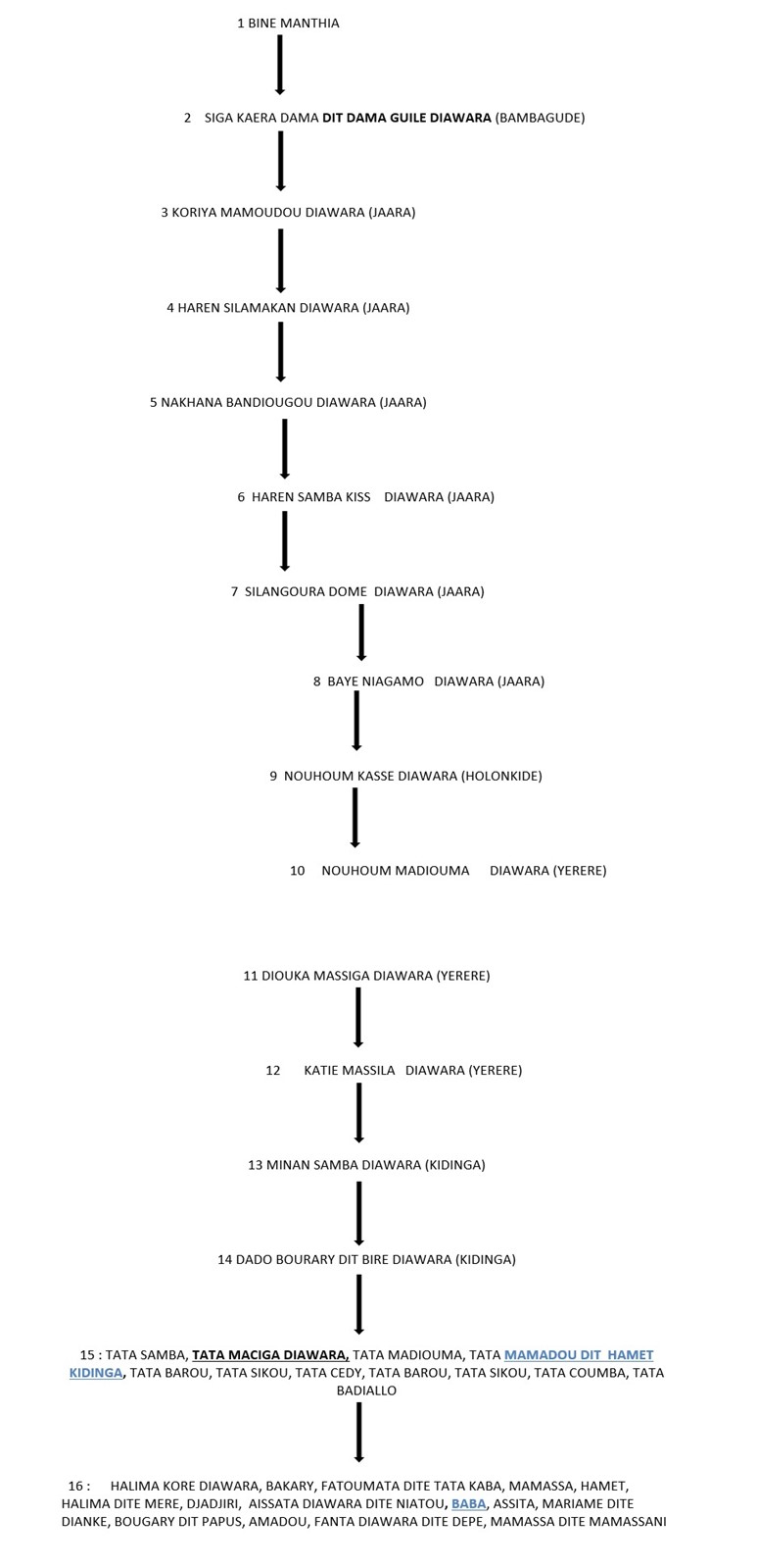 Nous sommes, nous les fils de Maciga, de Mamadou dit Hamet, et de Cedy la 16 eme génération depuis Biné Manthia qui est le père de Dama Guile Diawara l’ancêtre commun de tous les Diawara