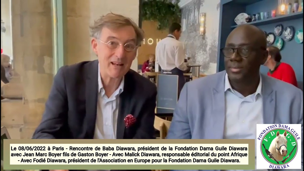 Rencontre entre le président de la Fondation Dama Guile Diawara, Baba Diawara - Avec Jean-Marc Boyer fils de Gaston Boyer auteur du livre " Un peuple de l'ouest Soudanais, les Diawara " écrit en 1946 / 1947 et édité en 1953 - Avec Malick Diawara du Sénégal, responsable éditorial du Point Afrique - Avec Fodié Diawara, président de l'Association en Europe pour la Fondation Dama Guile Diawara et responsable de communication et marketing de la Fondation Dama Guile Diawara - Jean-Marc Boyer est désormais président d'honneur et ambassadeur de bonne volonté de la Fondation Dama Guile Diawara.