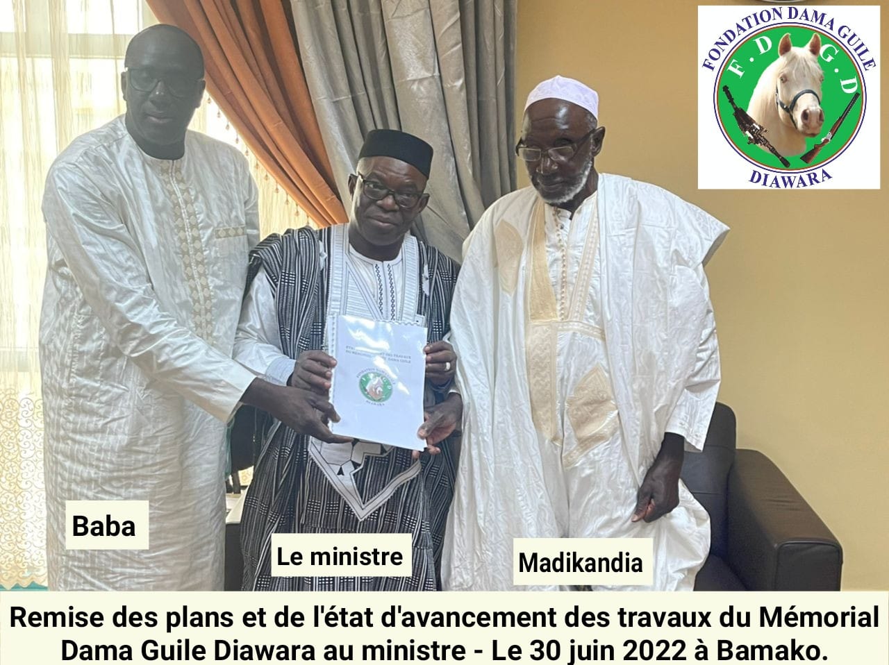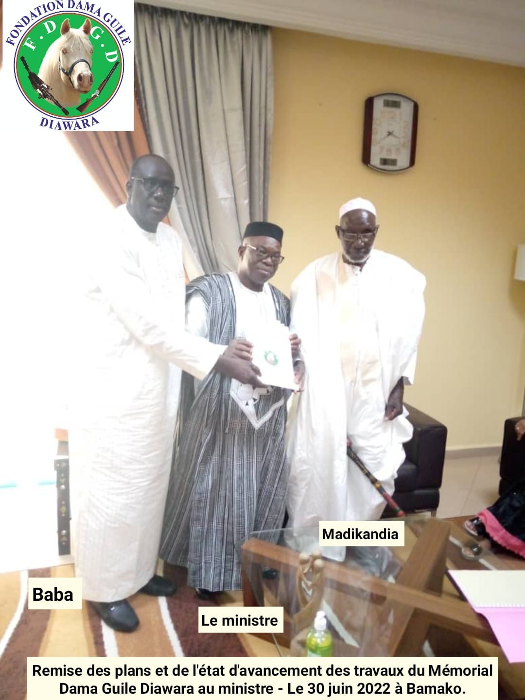 Mr Ondogoly Guindo Ministre de la Culture de l'artisanat et du Tourisme du Mali a reçu en audience le 30 Juin 2022 à Bamako le président de la Fondation Dama Guile Diawara, avec Mme Touré Coumba Diawara Trésorerie générale, Karounga Diawara secrétaire en charge des arts et de la Culture, Madikandia Diawara chef des Diawara de Bamako et Mr Cheikne Detteba Kamissoko secrétaire administratif de Diawara Kafo