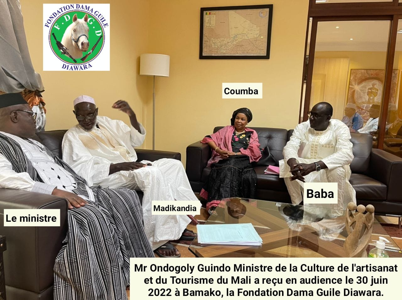 Mr Ondogoly Guindo Ministre de la Culture de l'artisanat et du Tourisme du Mali a reçu en audience le 30 Juin 2022 à Bamako le président de la Fondation Dama Guile Diawara, avec Mme Touré Coumba Diawara Trésorerie générale, Karounga Diawara secrétaire en charge des arts et de la Culture, Madikandia Diawara chef des Diawara de Bamako et Mr Cheikne Detteba Kamissoko secrétaire administratif de Diawara Kafo